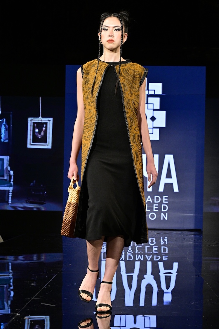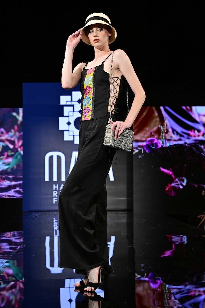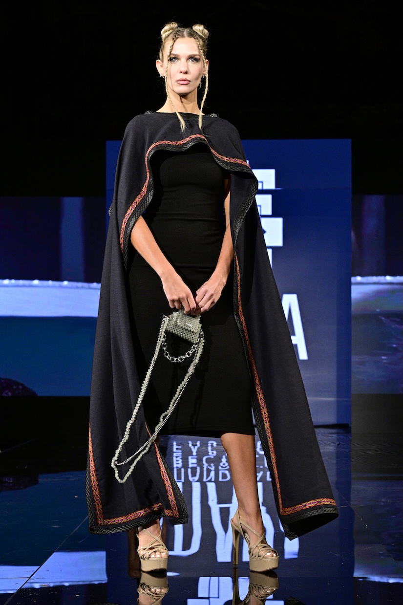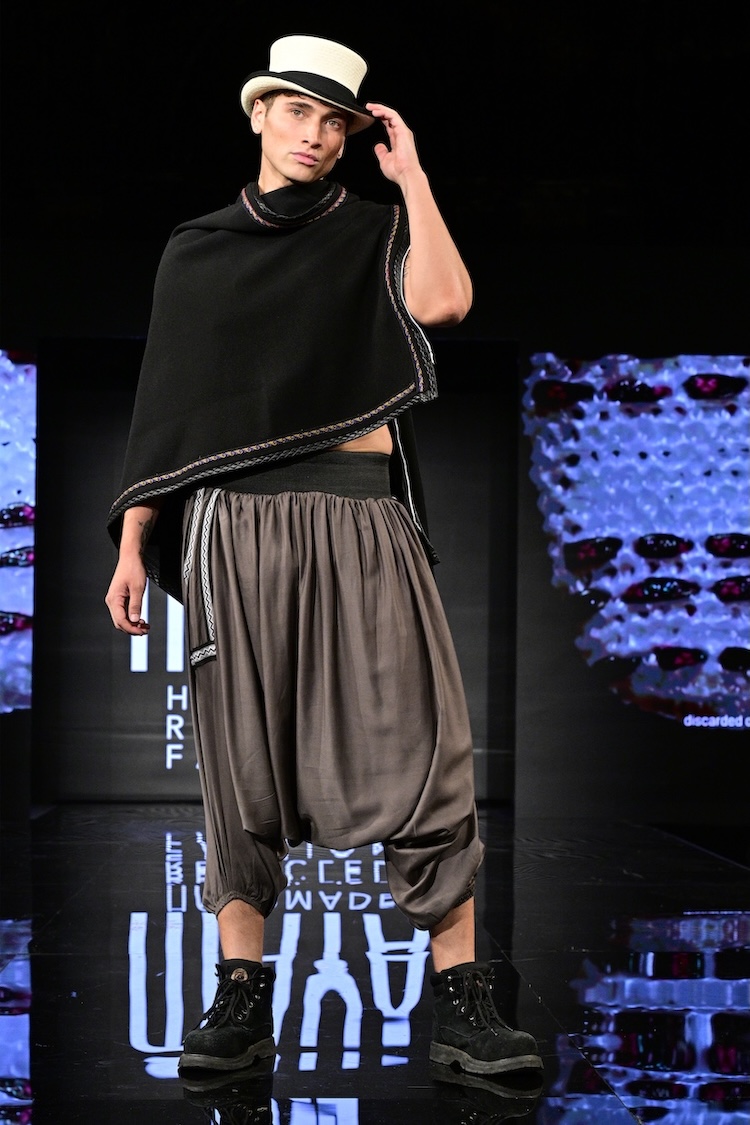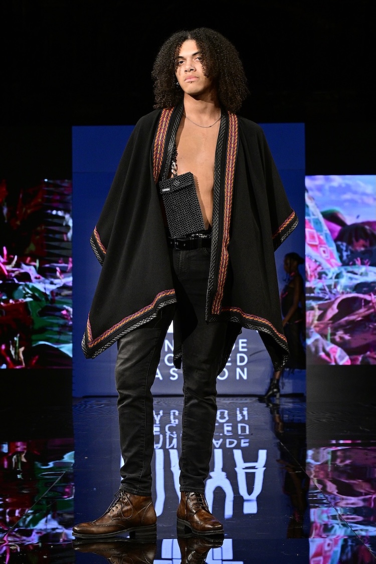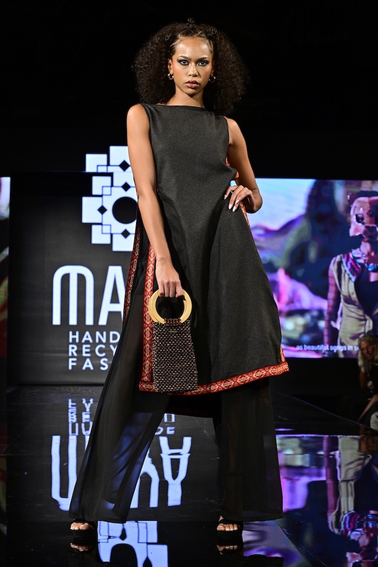 Sustainable fashion brand Maya made their New York Fashion Week debut as the first designer showcased on the Art Hearts Fashion runway. Black was a prominent color among the runway, with subtle hints of red patterning along the edges of the fabrics. Ecuadorian designer María Ángeles Hernández was inspired by the traditional weaving techniques they were taught as a child, and garments are made with recycled materials. An advocate for ethical fashion, Maya’s new collection is environmentally conscious and invokes a love for nature.