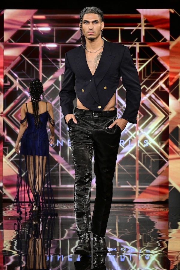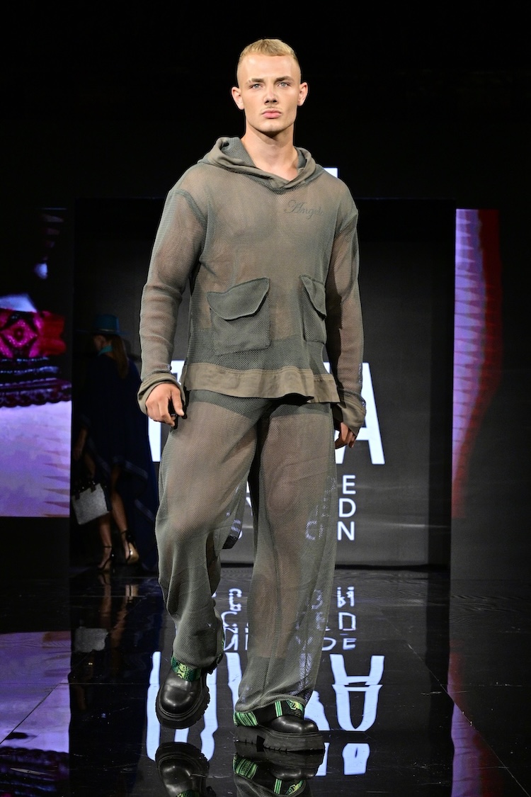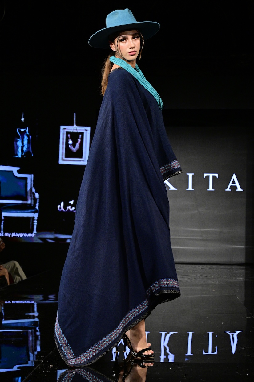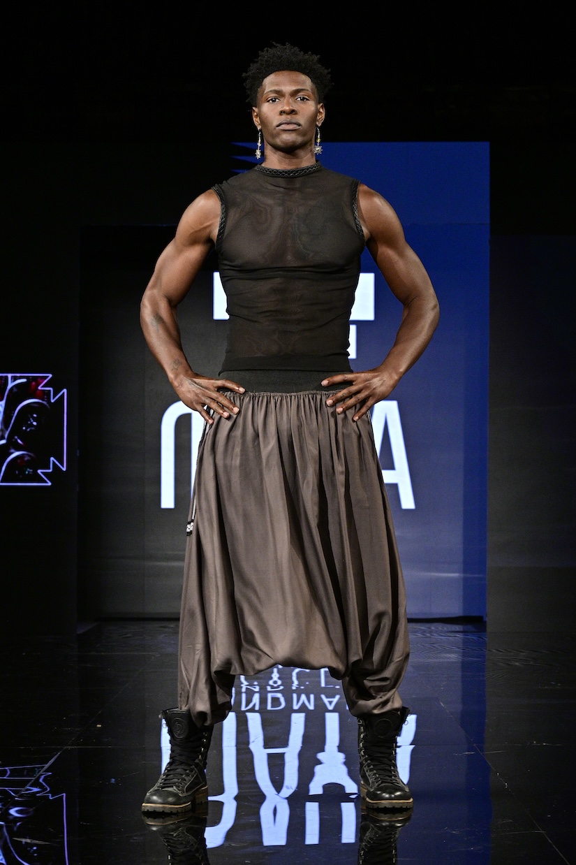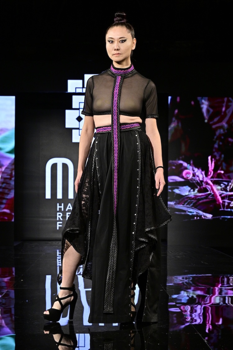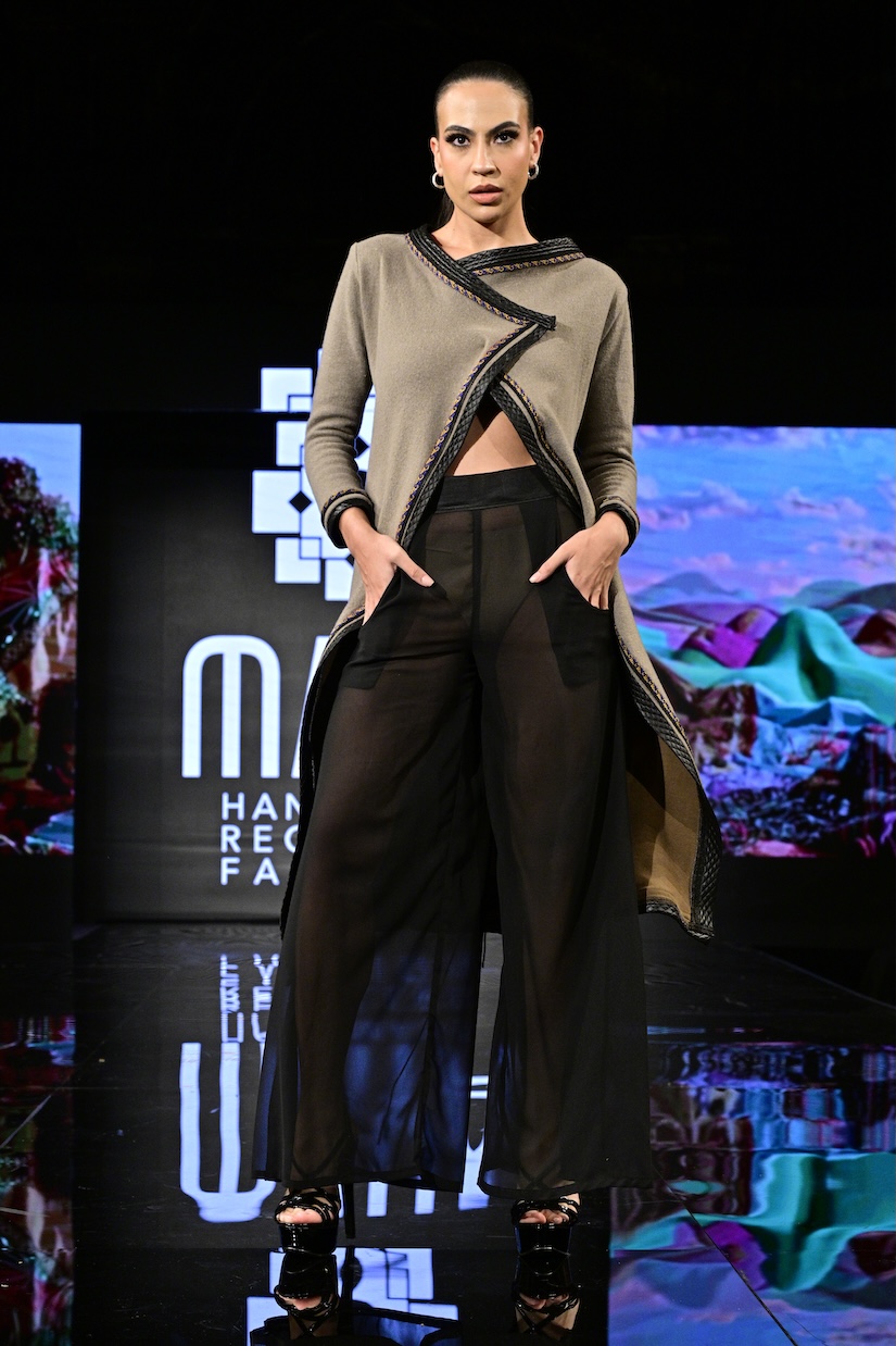Sustainable fashion brand Maya made their New York Fashion Week debut as the first designer showcased on the Art Hearts Fashion runway. Black was a prominent color among the runway, with subtle hints of red patterning along the edges of the fabrics. Ecuadorian designer María Ángeles Hernández was inspired by the traditional weaving techniques they were taught as a child, and garments are made with recycled materials. An advocate for ethical fashion, Maya’s new collection is environmentally conscious and invokes a love for nature.