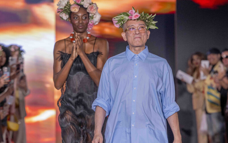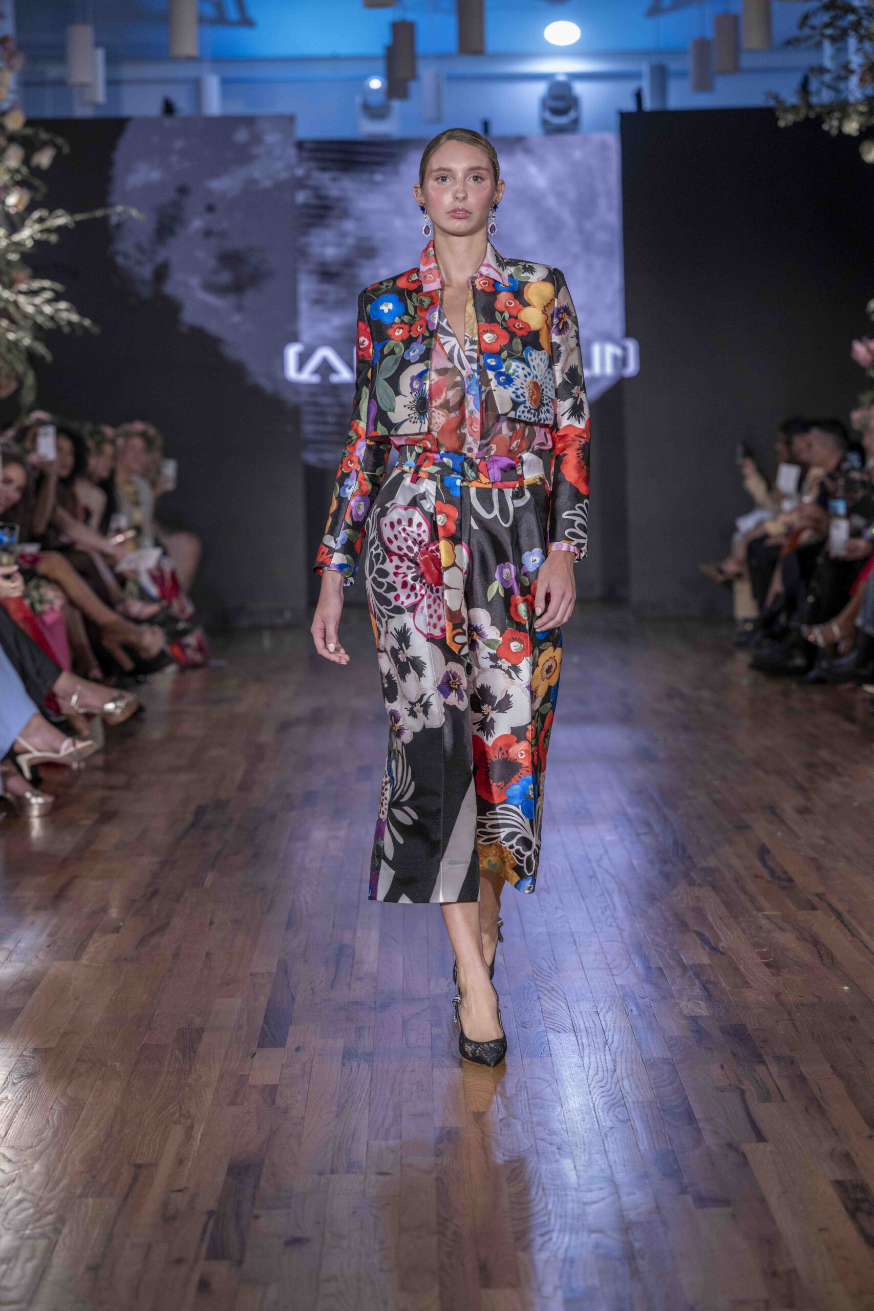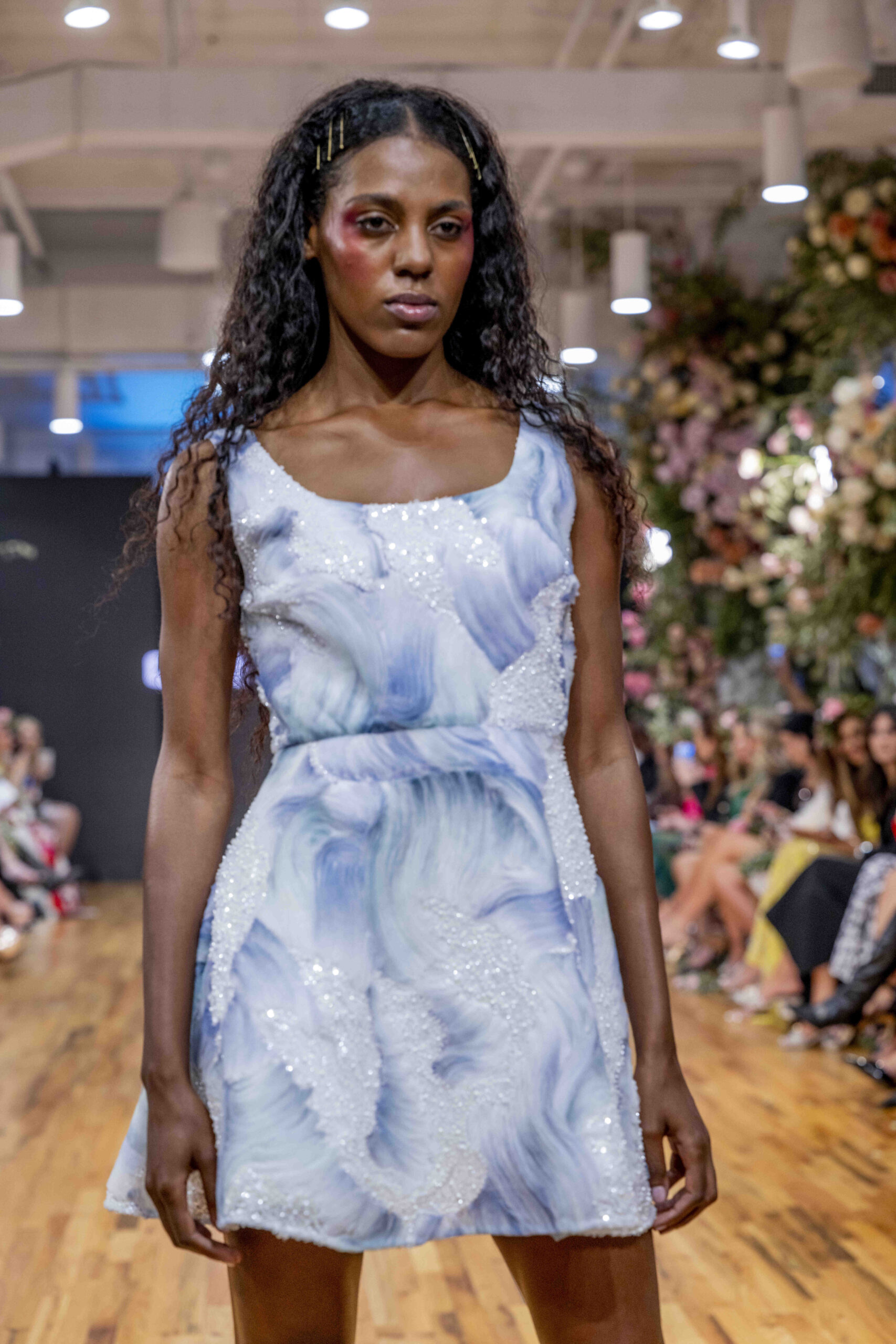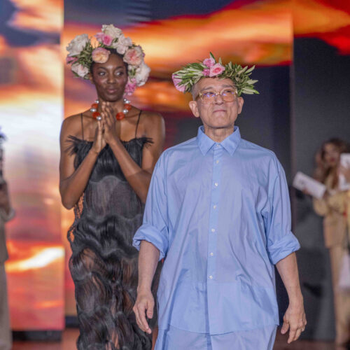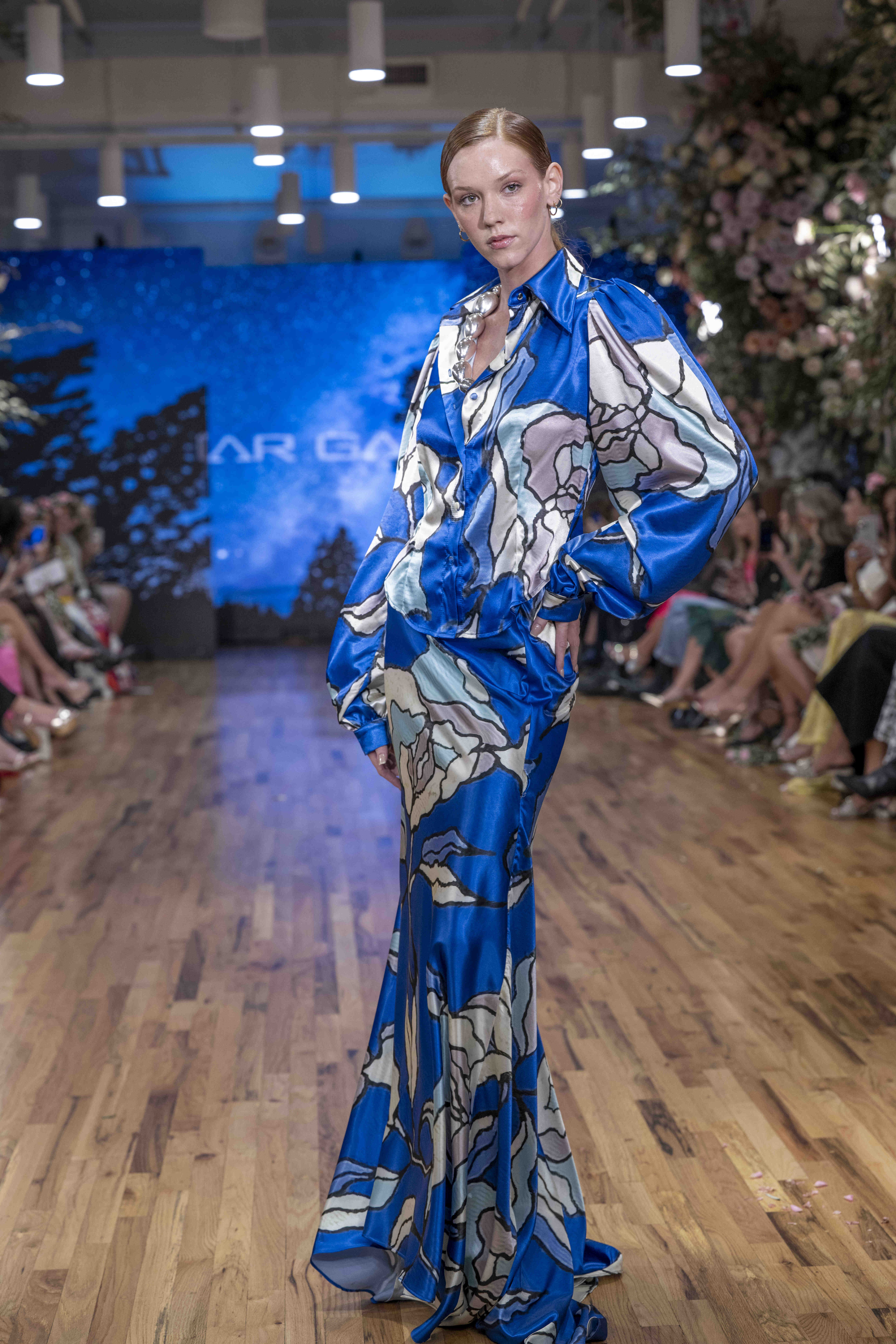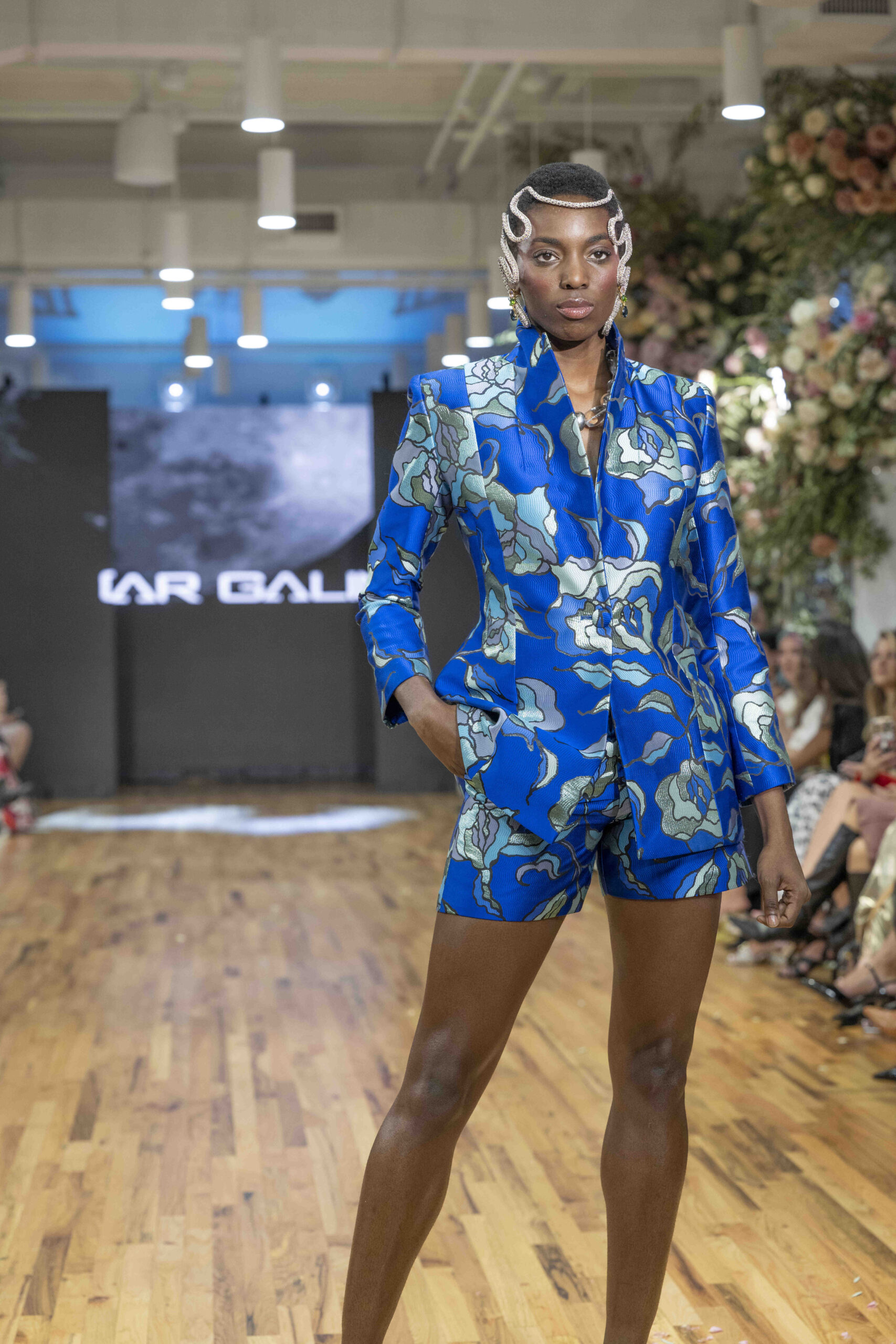 Tonight, César Galindo delivered a spring/summer 2026 collection that was a riot of florals, prints, and unapologetic joy. From the moment guests entered, the tone was set: every front-row attendee was gifted a flower crown, transforming the audience into part of the blooming spectacle. It was a clever and intimate touch—an invitation to share in Galindo’s garden of vibrant fabrics and large-scale prints that made the runway feel alive with movement.