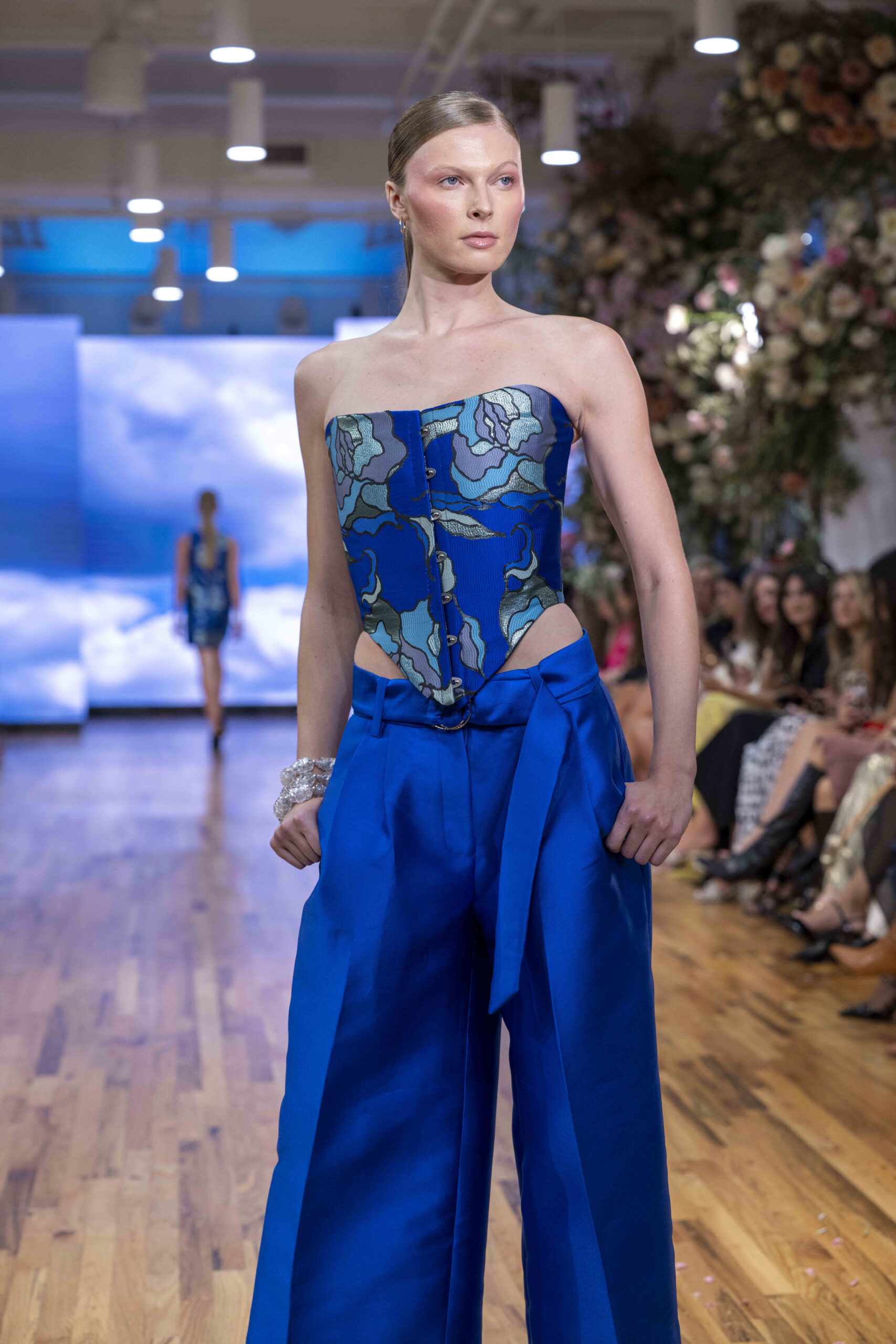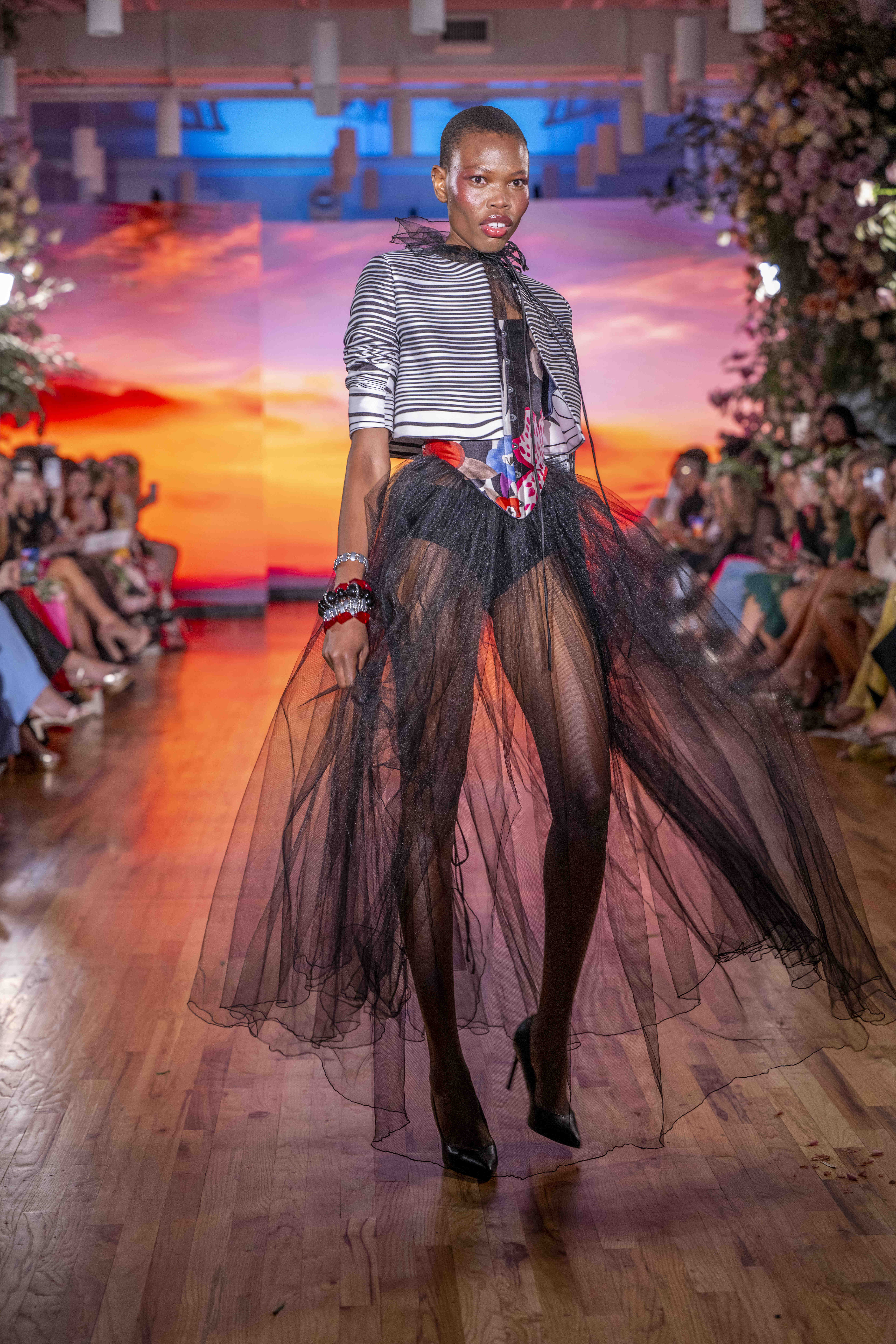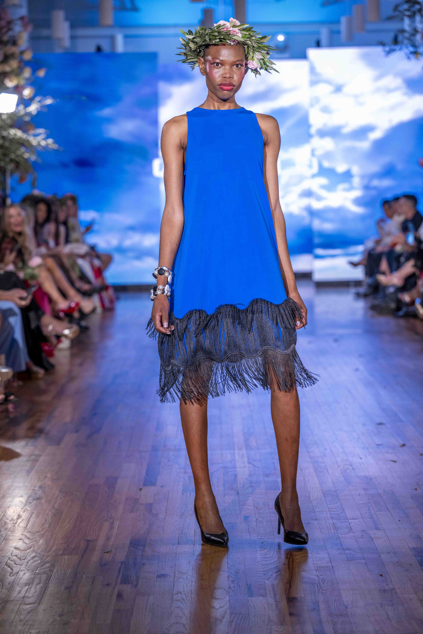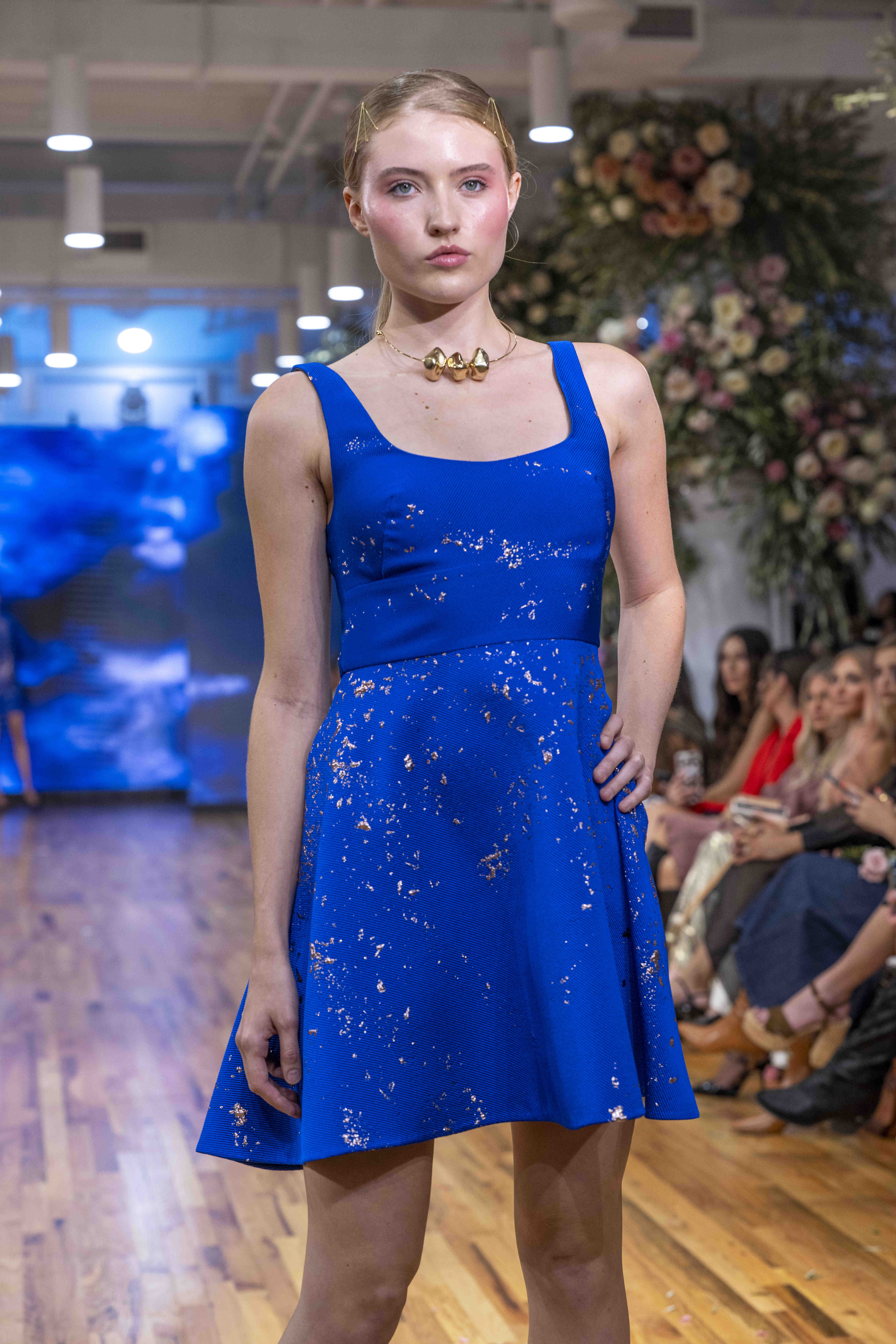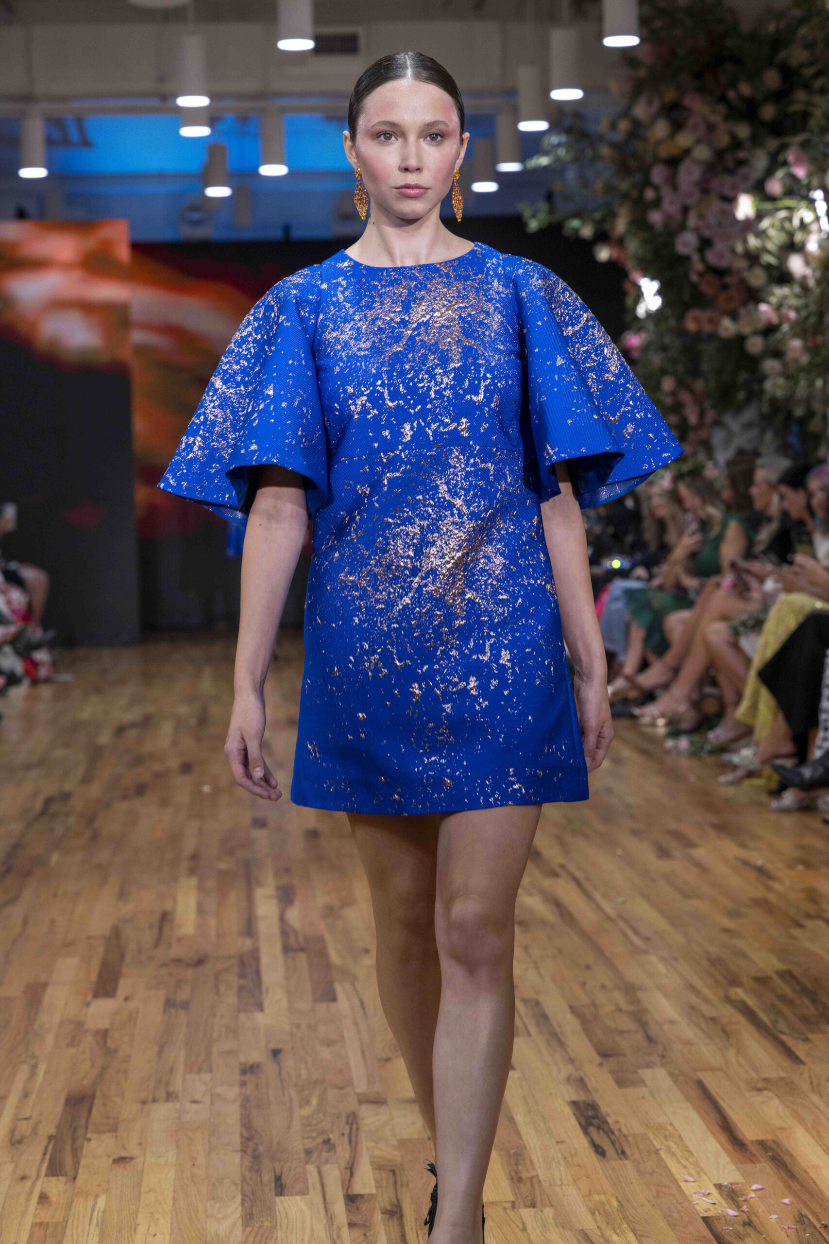 Tonight, César Galindo delivered a spring/summer 2026 collection that was a riot of florals, prints, and unapologetic joy. From the moment guests entered, the tone was set: every front-row attendee was gifted a flower crown, transforming the audience into part of the blooming spectacle. It was a clever and intimate touch—an invitation to share in Galindo’s garden of vibrant fabrics and large-scale prints that made the runway feel alive with movement.