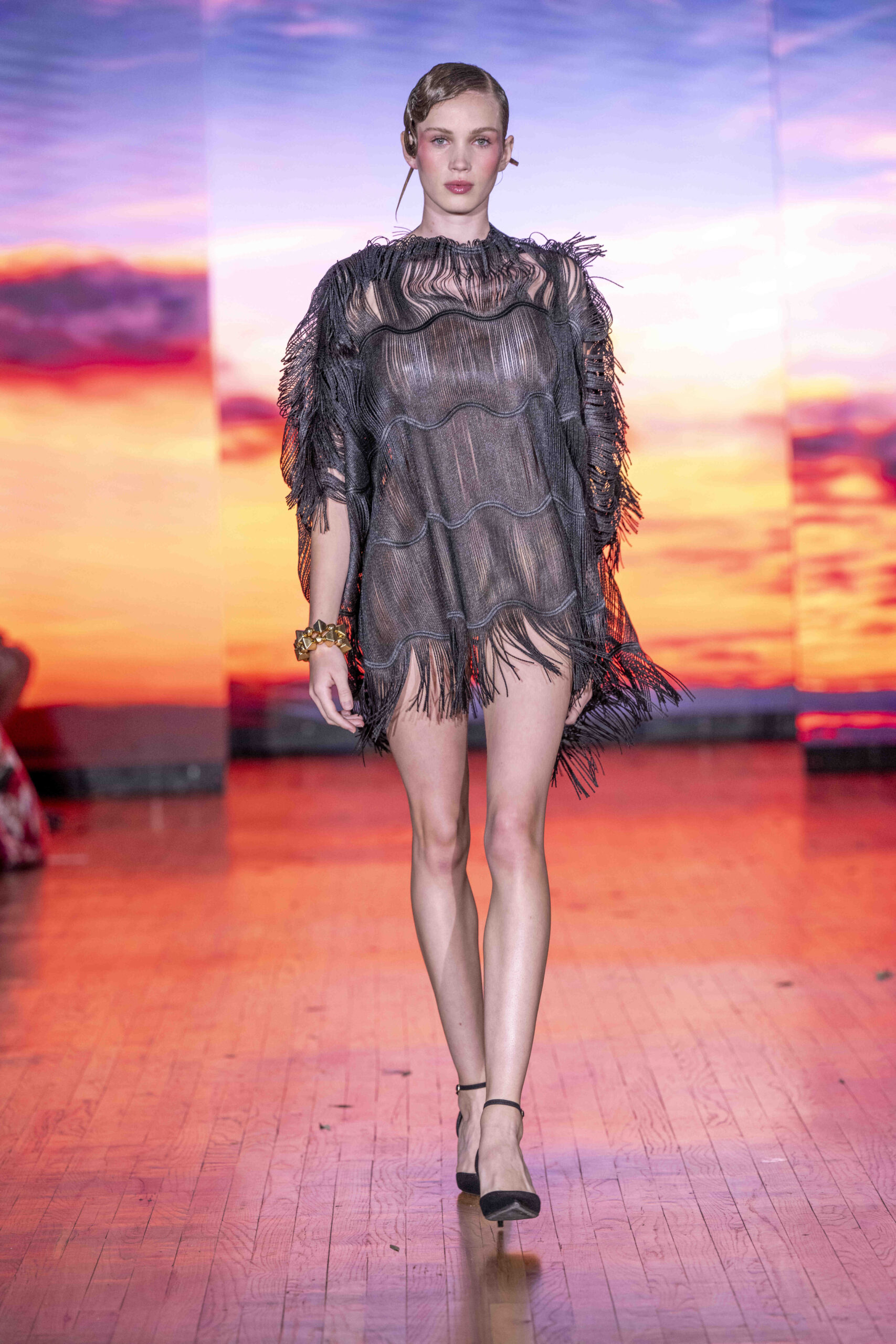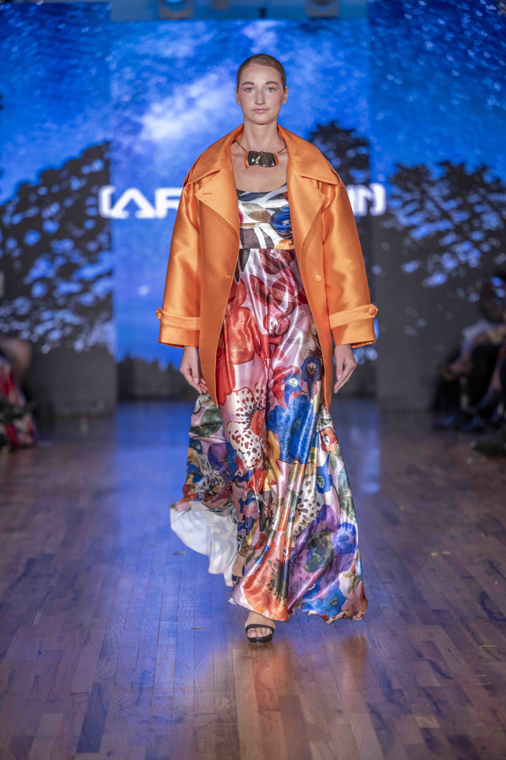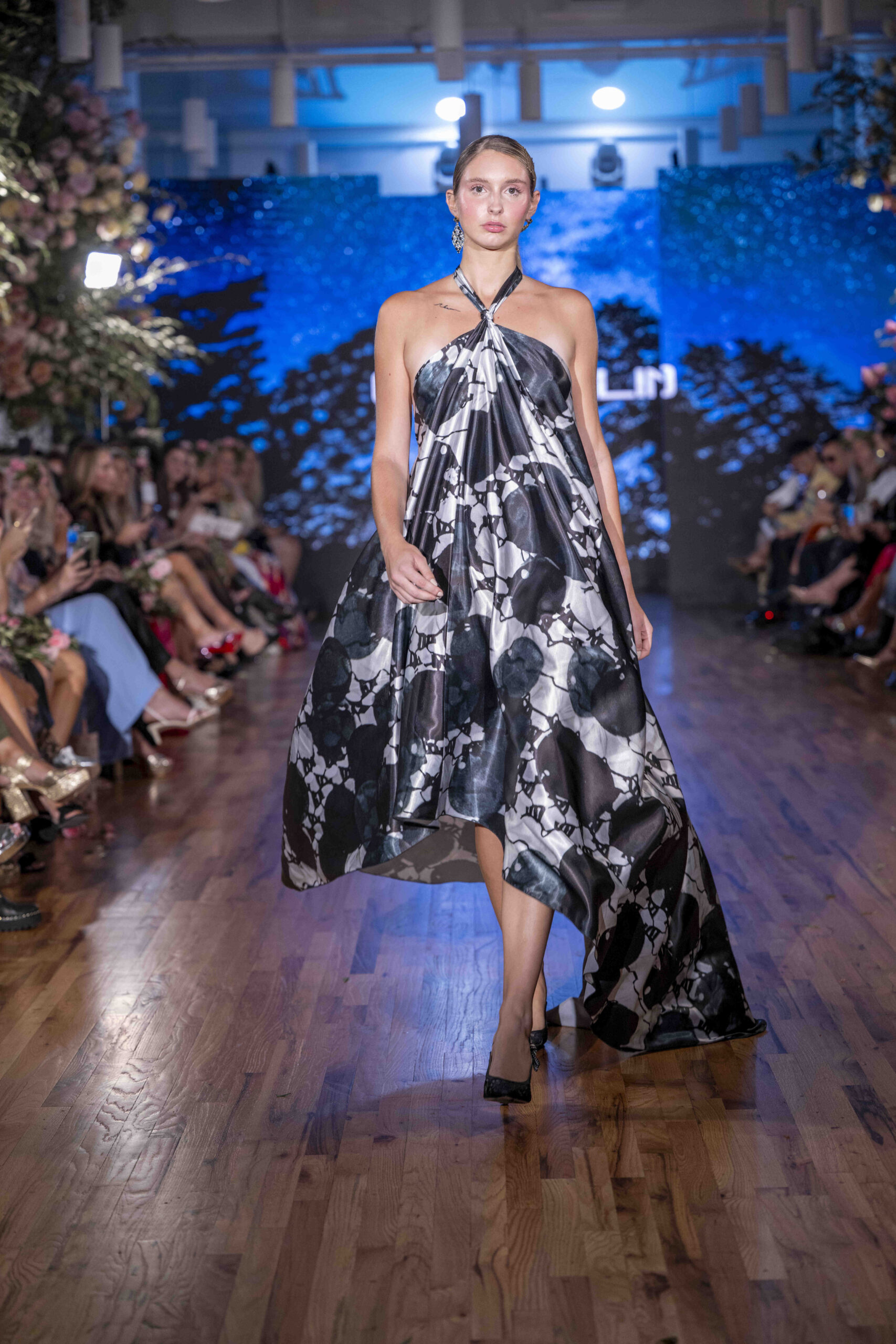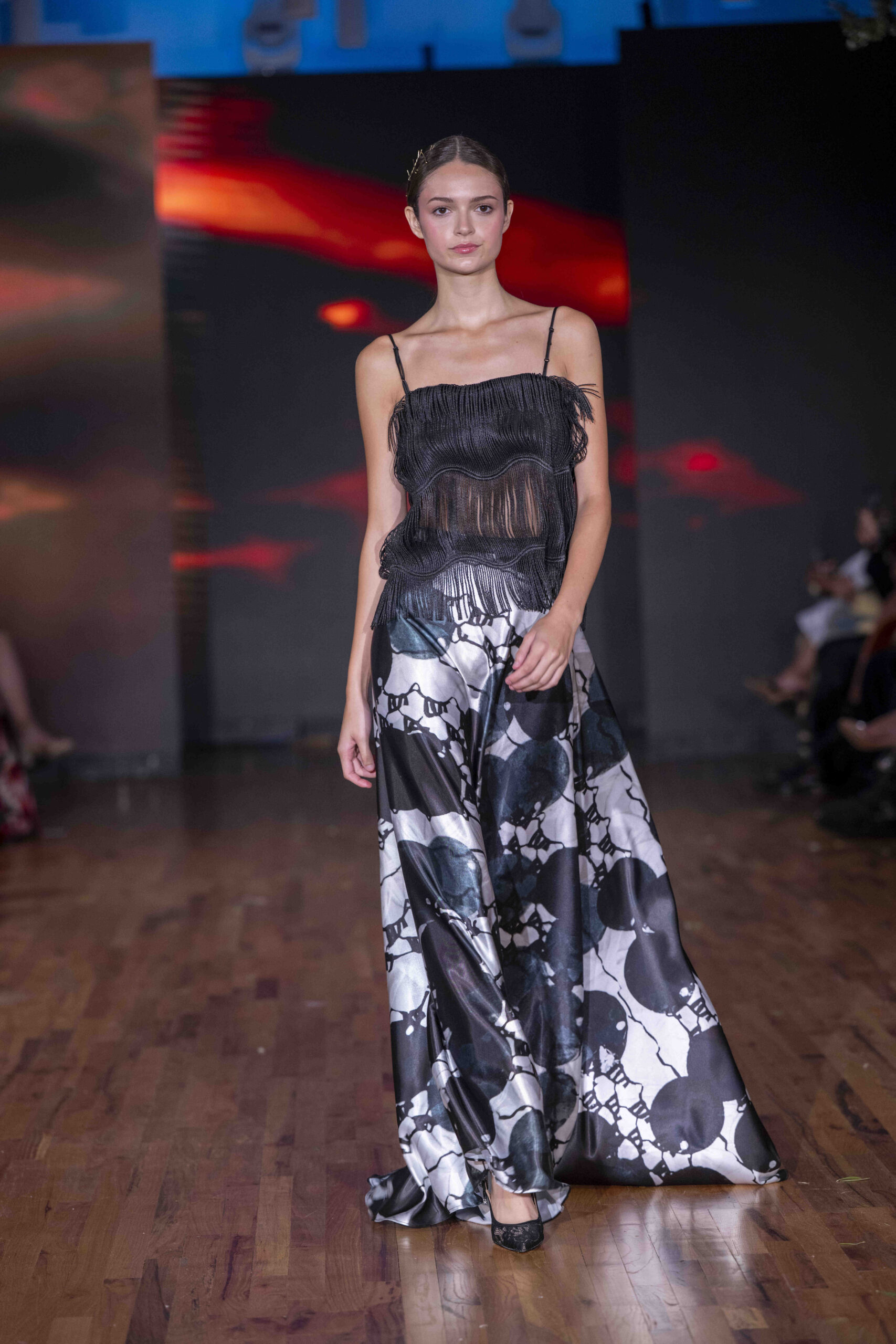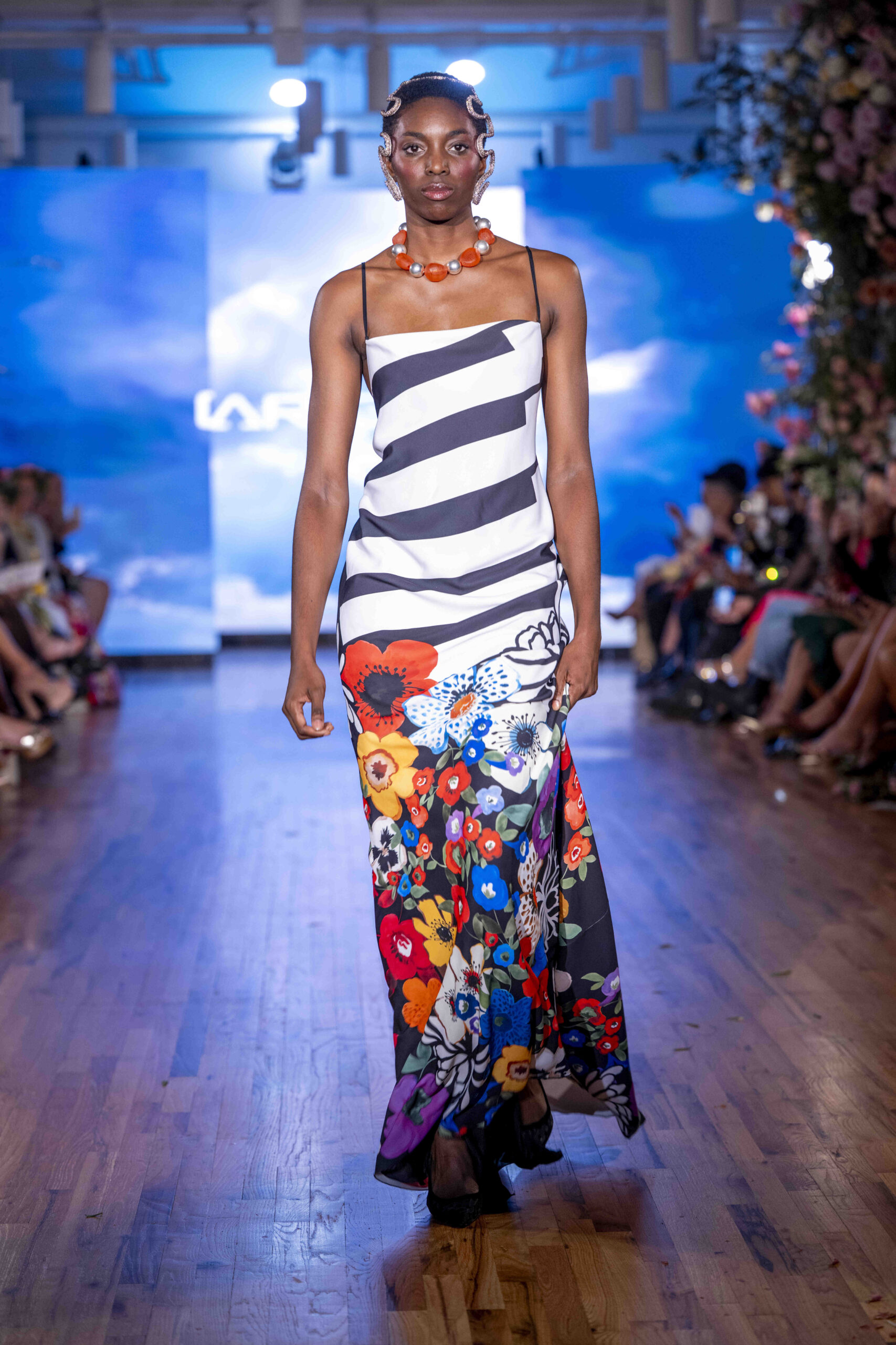 Tonight, César Galindo delivered a spring/summer 2026 collection that was a riot of florals, prints, and unapologetic joy. From the moment guests entered, the tone was set: every front-row attendee was gifted a flower crown, transforming the audience into part of the blooming spectacle. It was a clever and intimate touch—an invitation to share in Galindo’s garden of vibrant fabrics and large-scale prints that made the runway feel alive with movement.