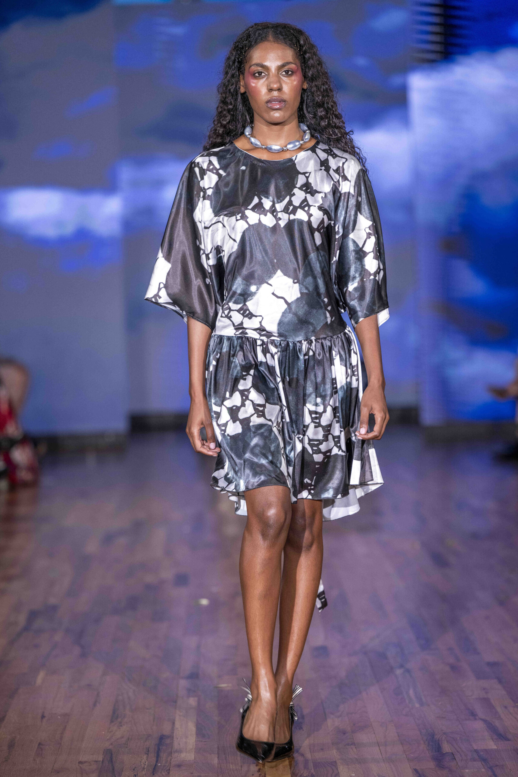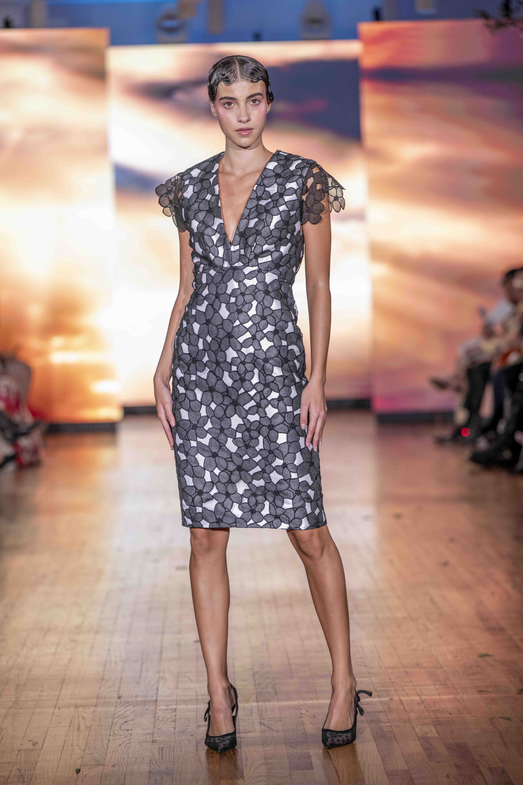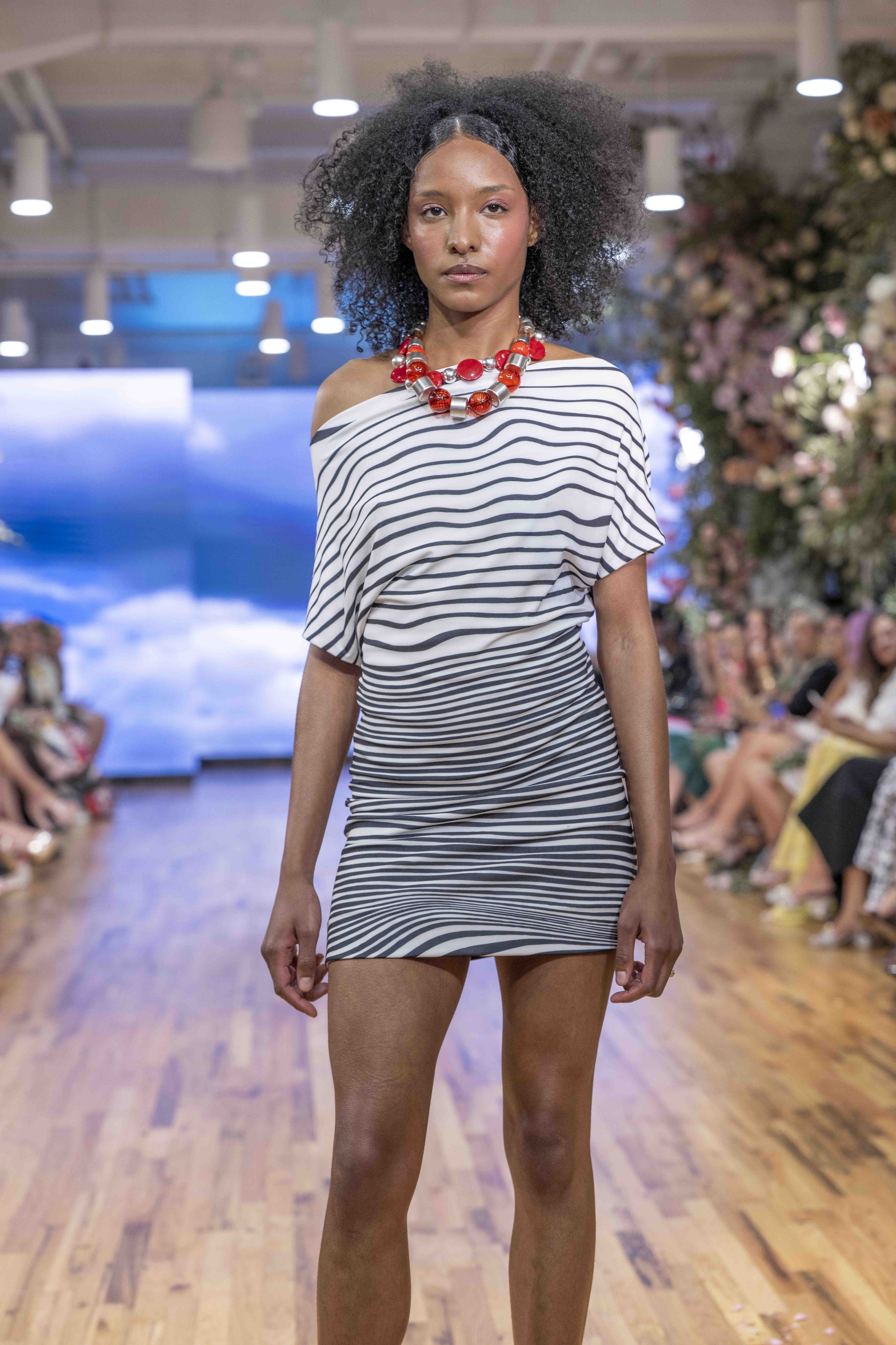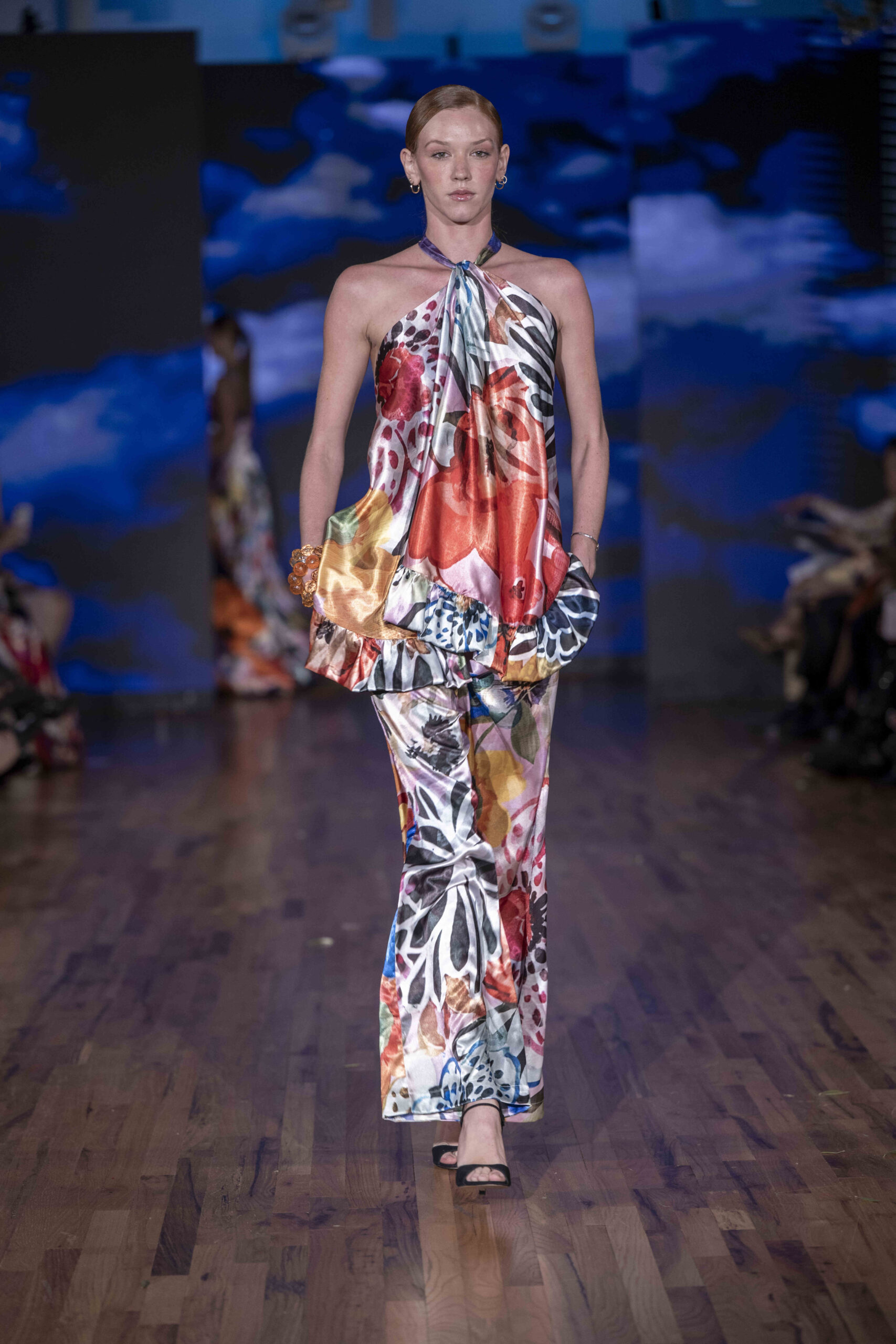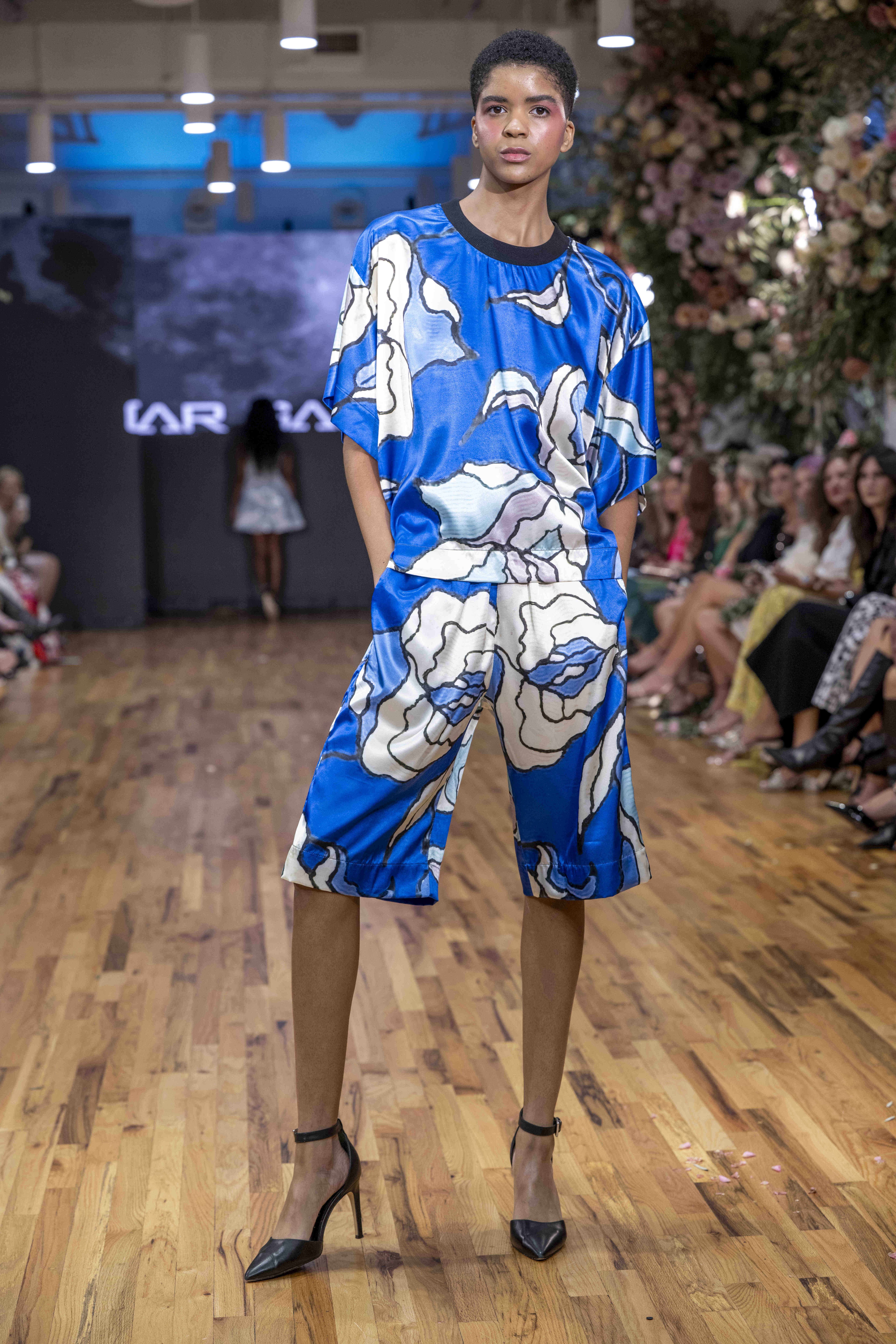 Galindo leaned heavily into bold florals and graphic prints, creating a dialogue between fluid femininity and confident structure. The silhouettes flowed easily—perfectly suited for warm weather—but the use of oversized blossoms and energetic patterns kept the eye engaged from look to look. Color was everywhere, and Galindo showed no fear of mixing palettes: from saturated blues to sharp black-and-white contrasts, the collection felt eclectic yet coherent, a painter’s canvas in motion.