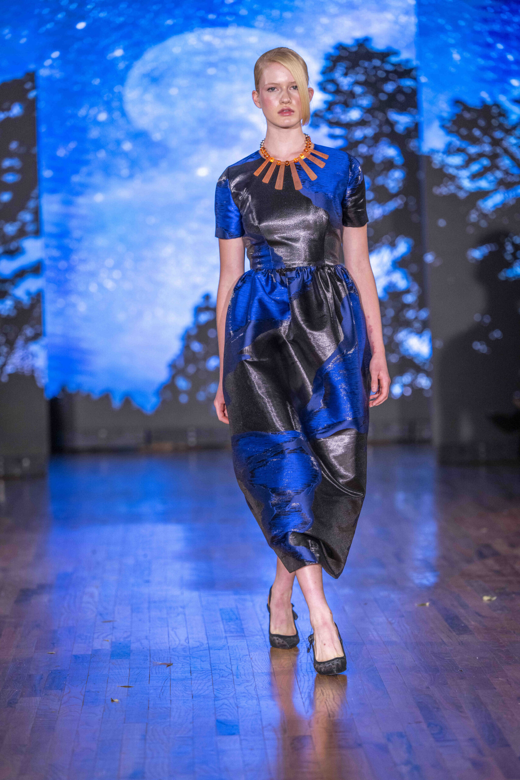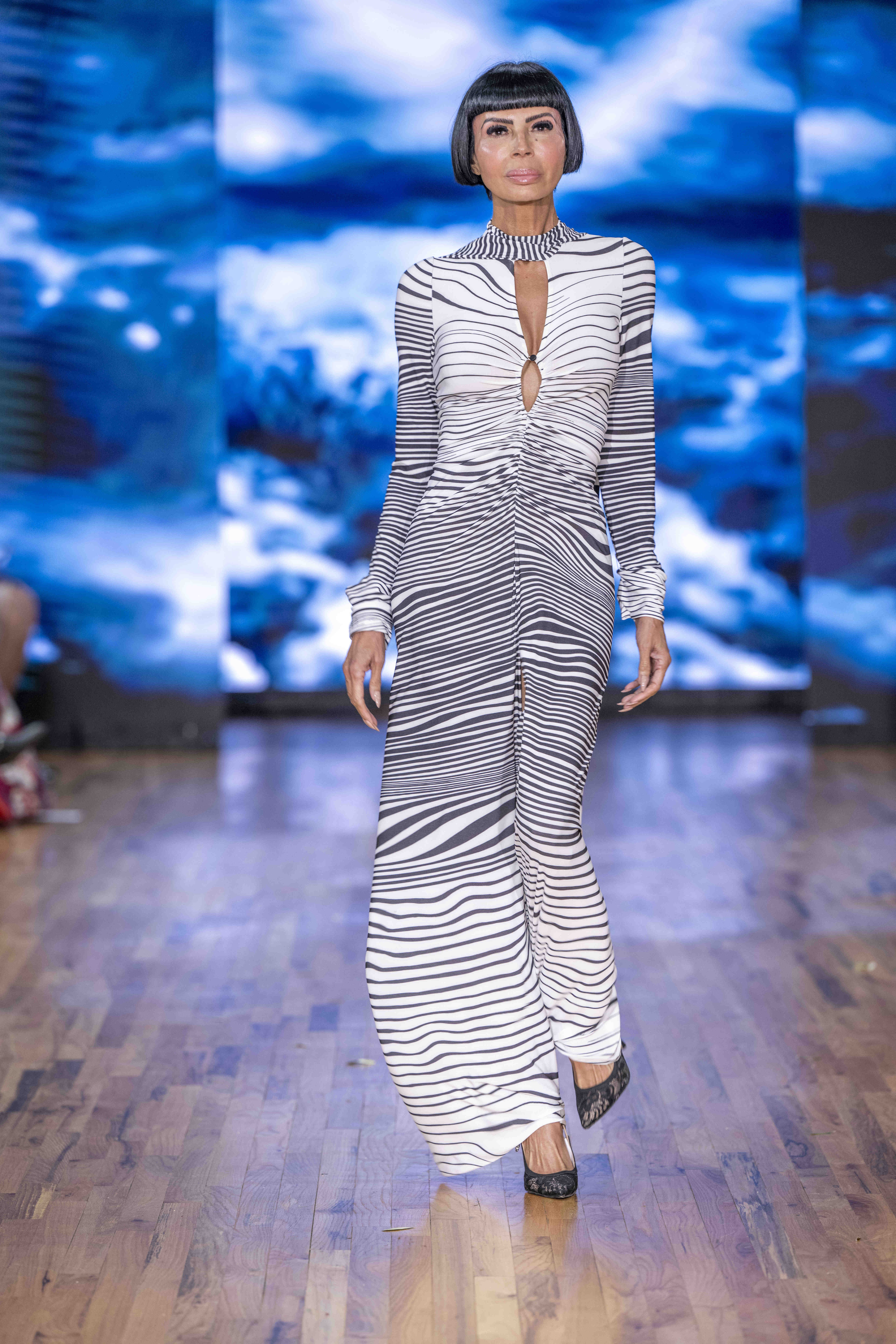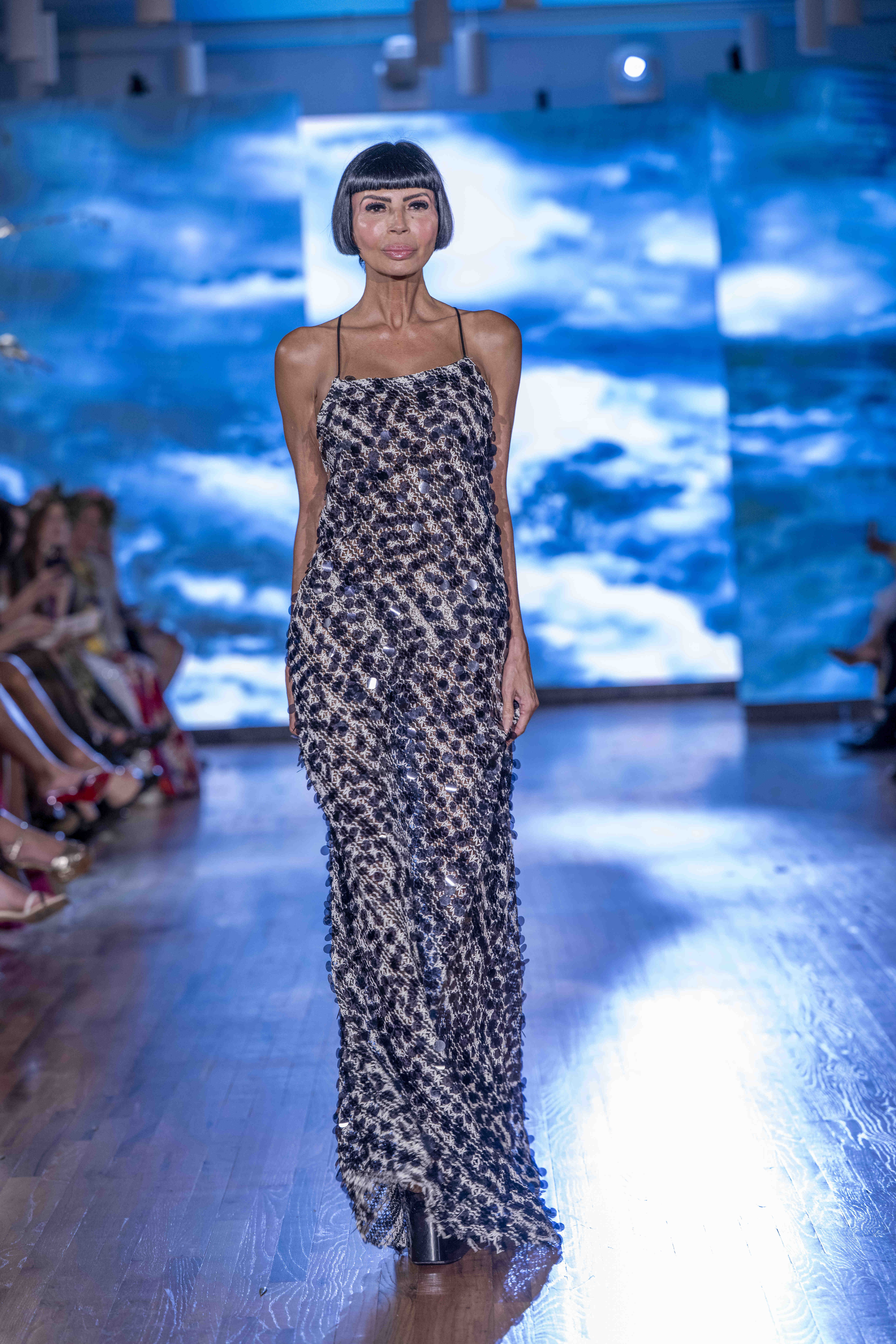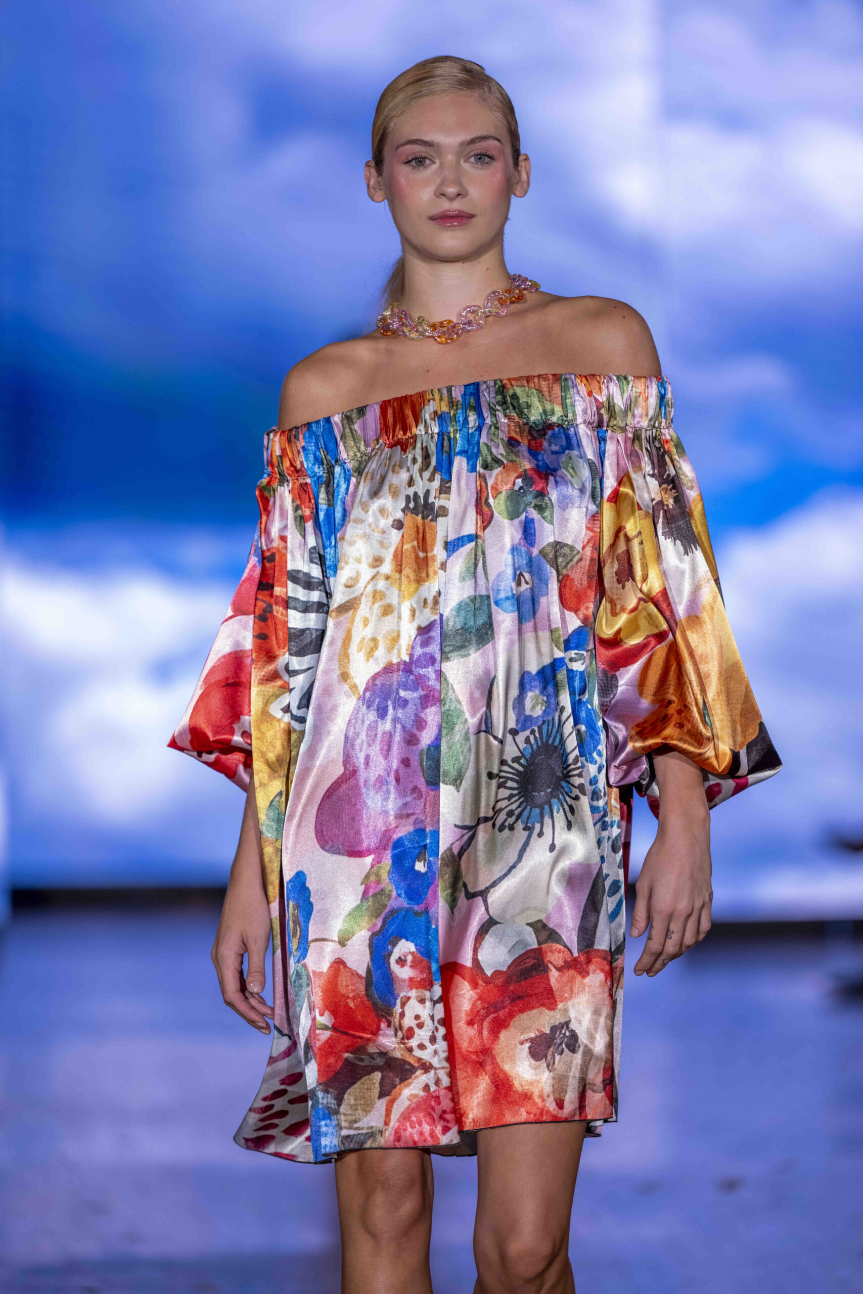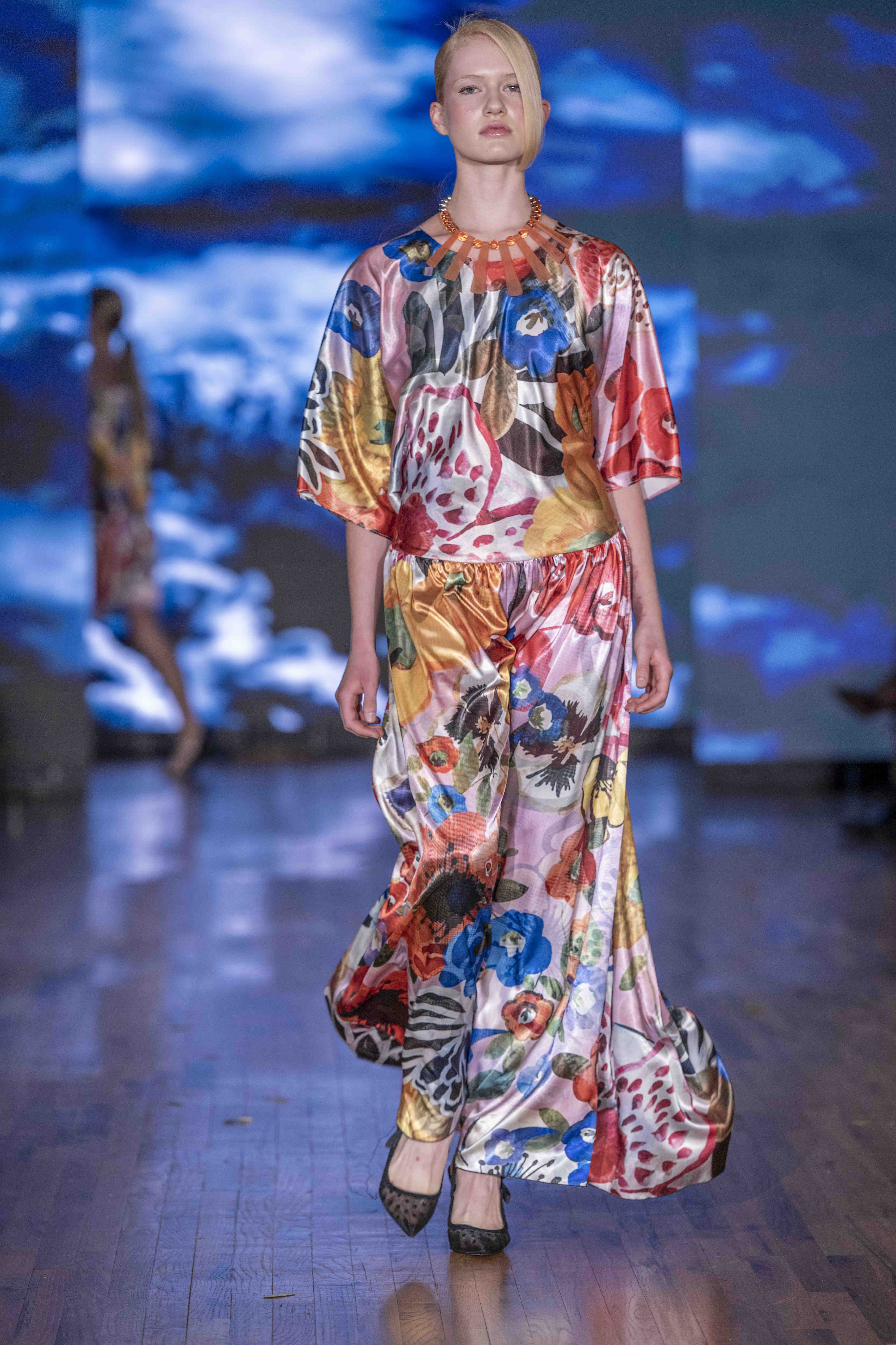 Galindo leaned heavily into bold florals and graphic prints, creating a dialogue between fluid femininity and confident structure. The silhouettes flowed easily—perfectly suited for warm weather—but the use of oversized blossoms and energetic patterns kept the eye engaged from look to look. Color was everywhere, and Galindo showed no fear of mixing palettes: from saturated blues to sharp black-and-white contrasts, the collection felt eclectic yet coherent, a painter’s canvas in motion.