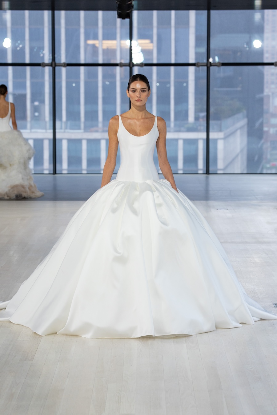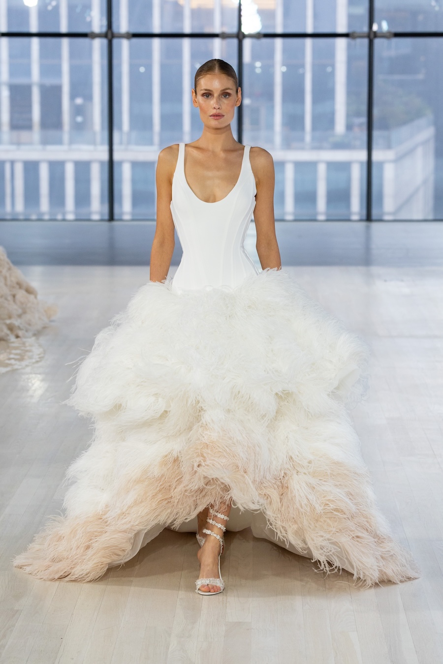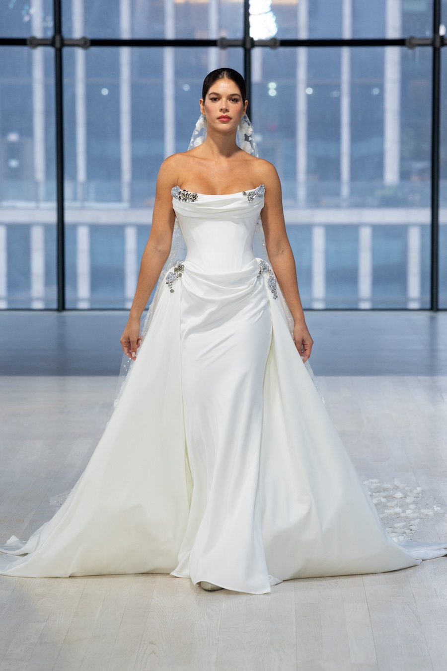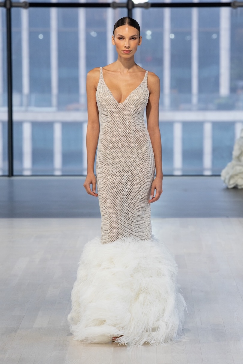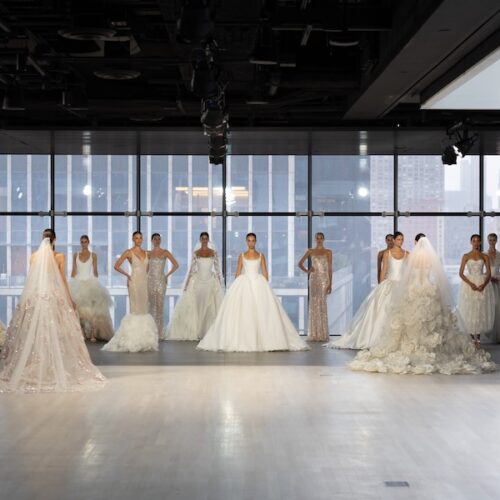 In honor of this year’s 10th anniversary, Nicole + Felicia created 30 looks for their Fall/Winter 2026 bridal collection. Structure was vital — corsetry was popular, while several dresses were stiffly shaped to flow beautifully around the models’ ankles. Tiny, tiny beadwork was also present, which demonstrated the time and effort the Nicole + Felicia team put into creating this collection. Finally, there’s no bridal collection without florals, and the brand didn’t disappoint! From beaded flowers to 3D fabric ones on veils, there was no shortage of traditional bridal cuts, themes, and silhouettes.