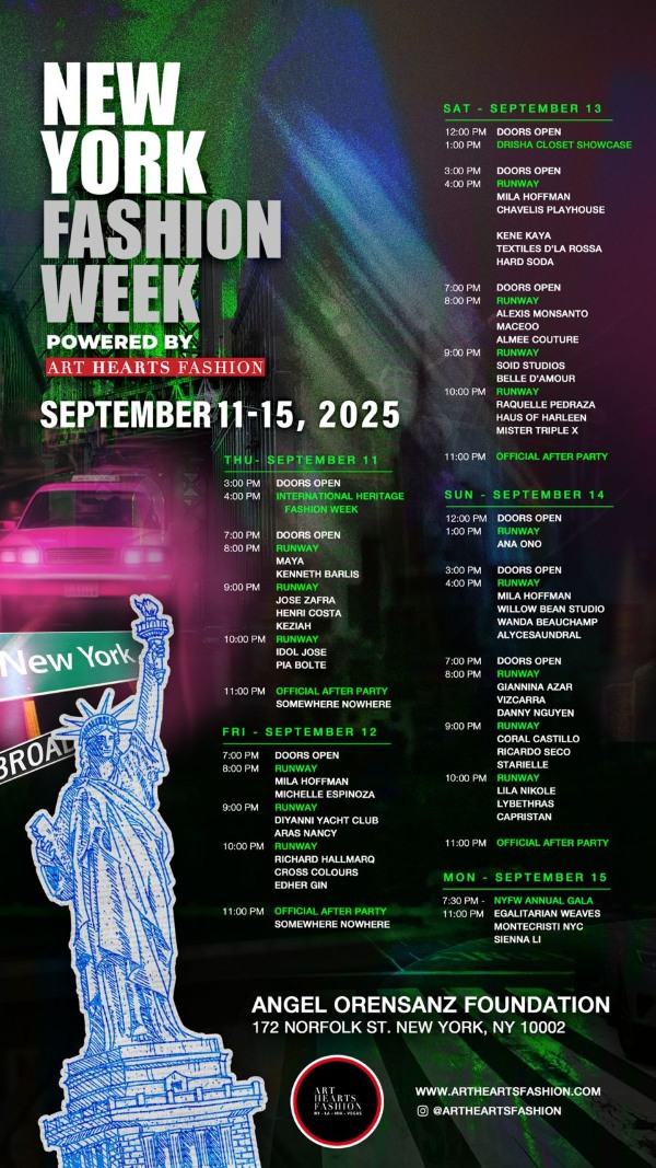 Coming back to NYC, New York Fashion Week powered by Art Hearts Fashion takes center stage from September 11-15, 2025. Hosted at the historic Angel Orensanz Foundation, the event spotlights over 40 international designers, including the highly anticipated AnaOno runway show.