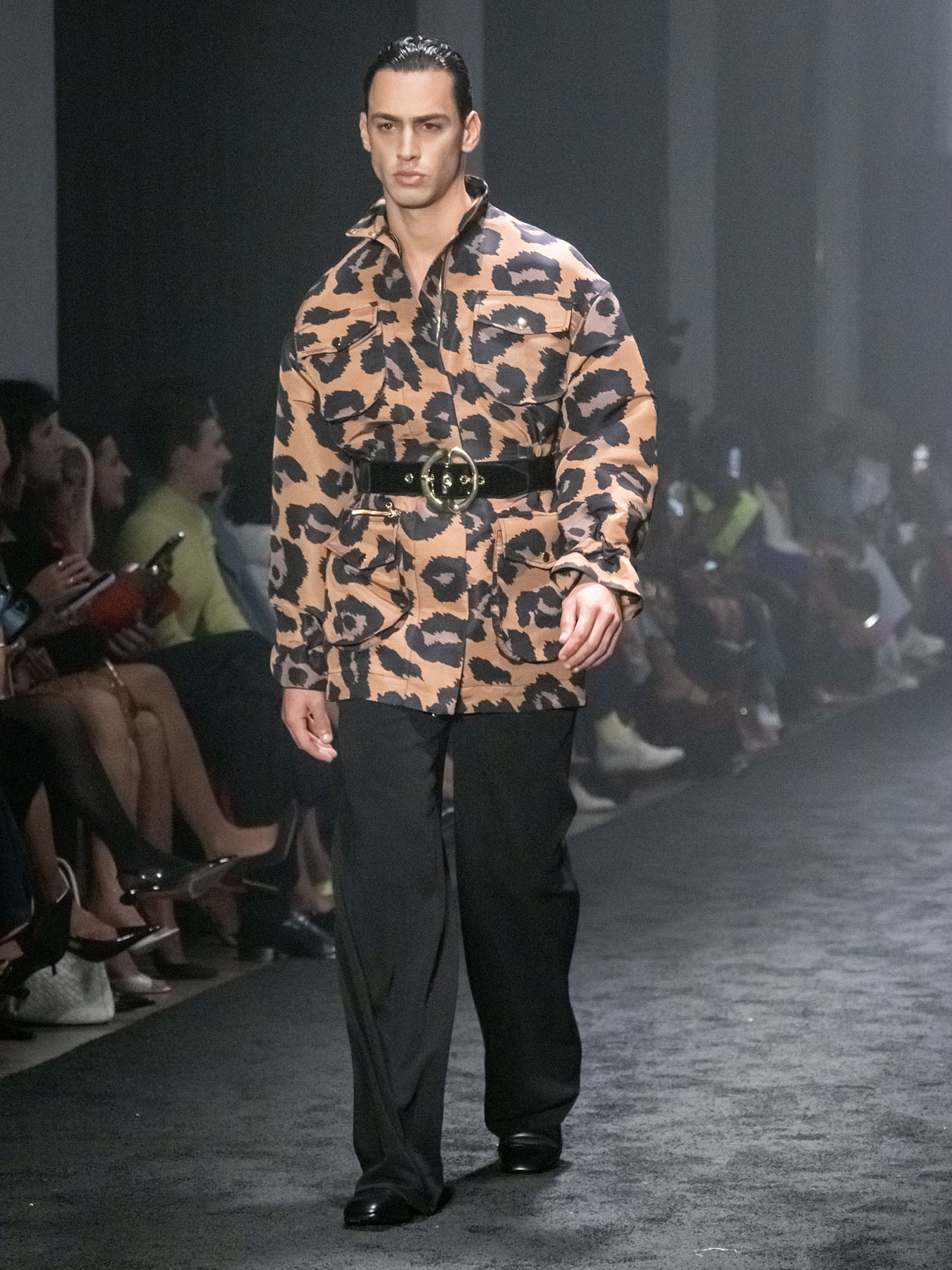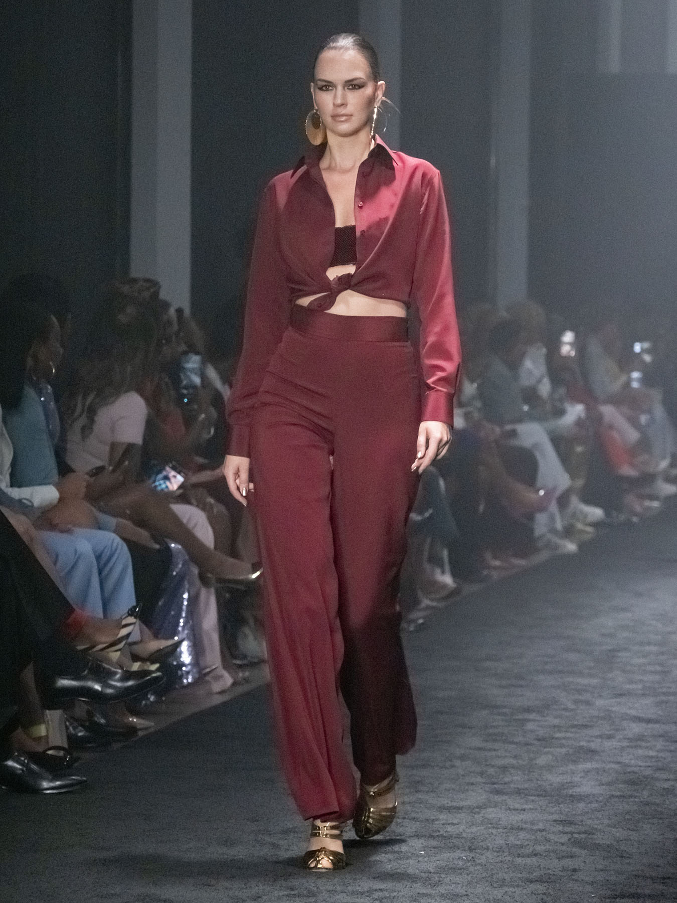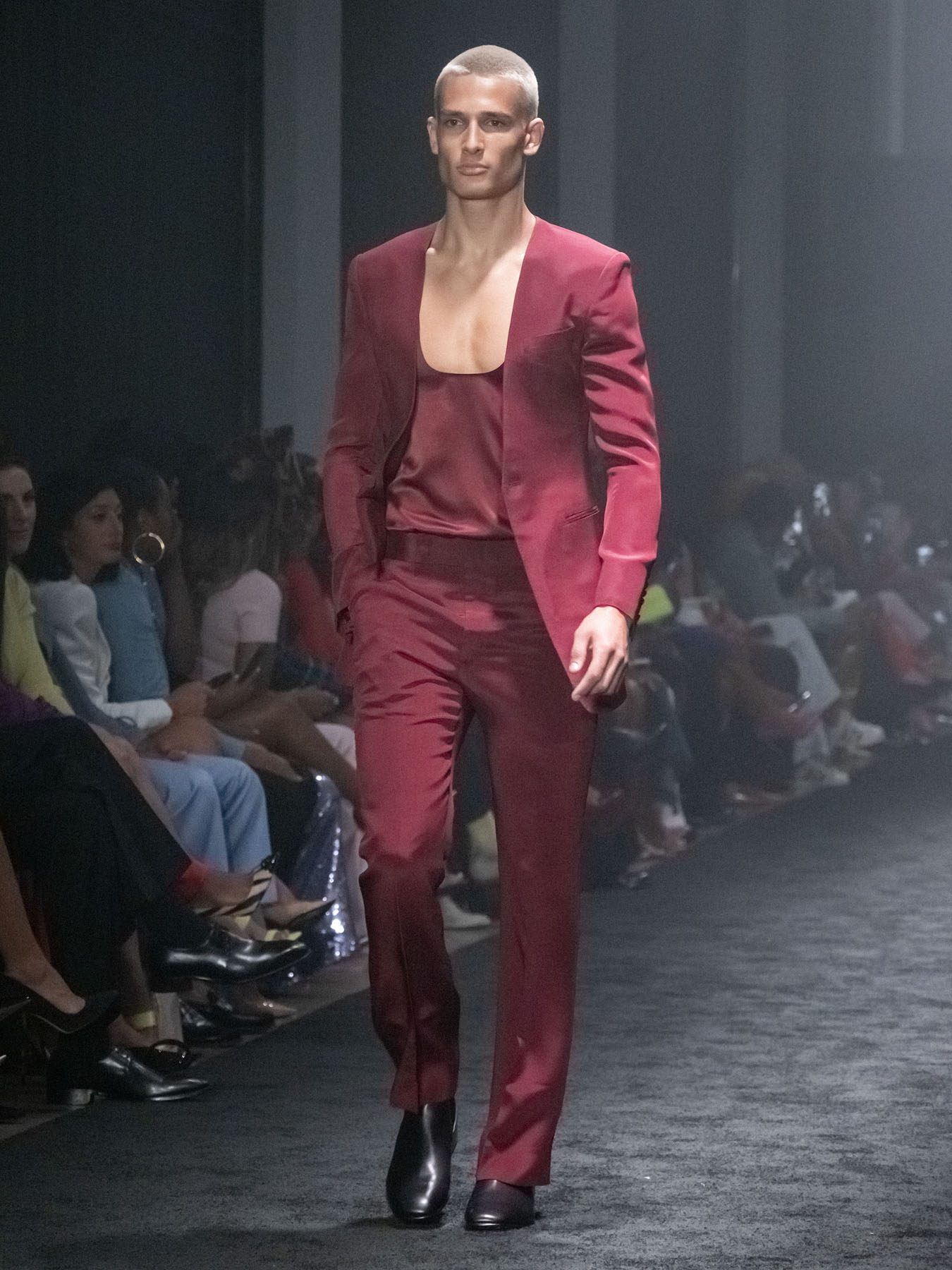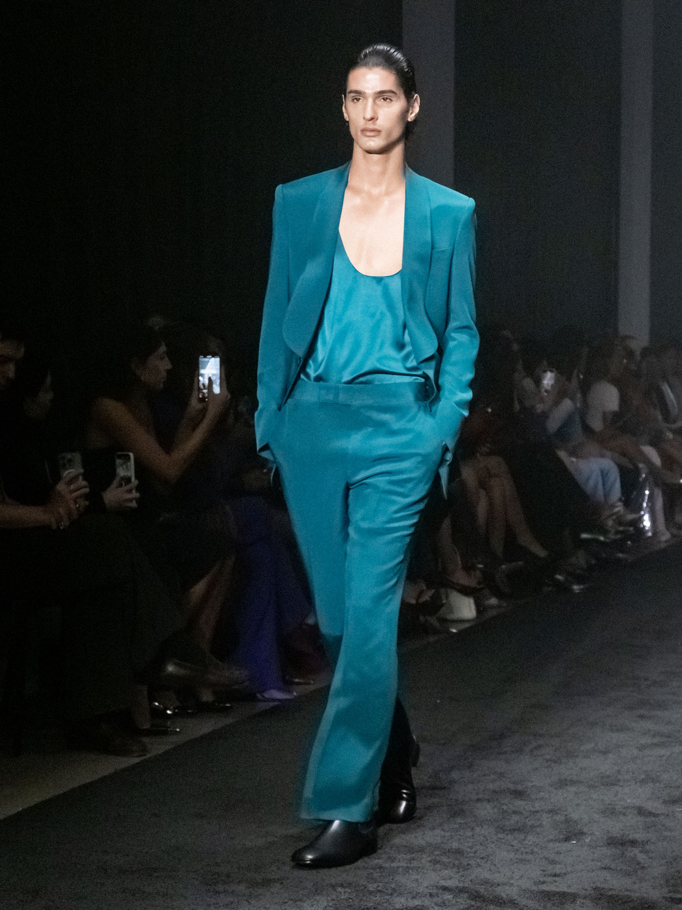 Hudson leaned into strong shoulders and stiff silhouettes that felt like armor. Tailoring was clean and bold: double-breasted suits, sharp lapels, and cinched waists contrasted with relaxed elements like pulled-up sleeves and softened hems.